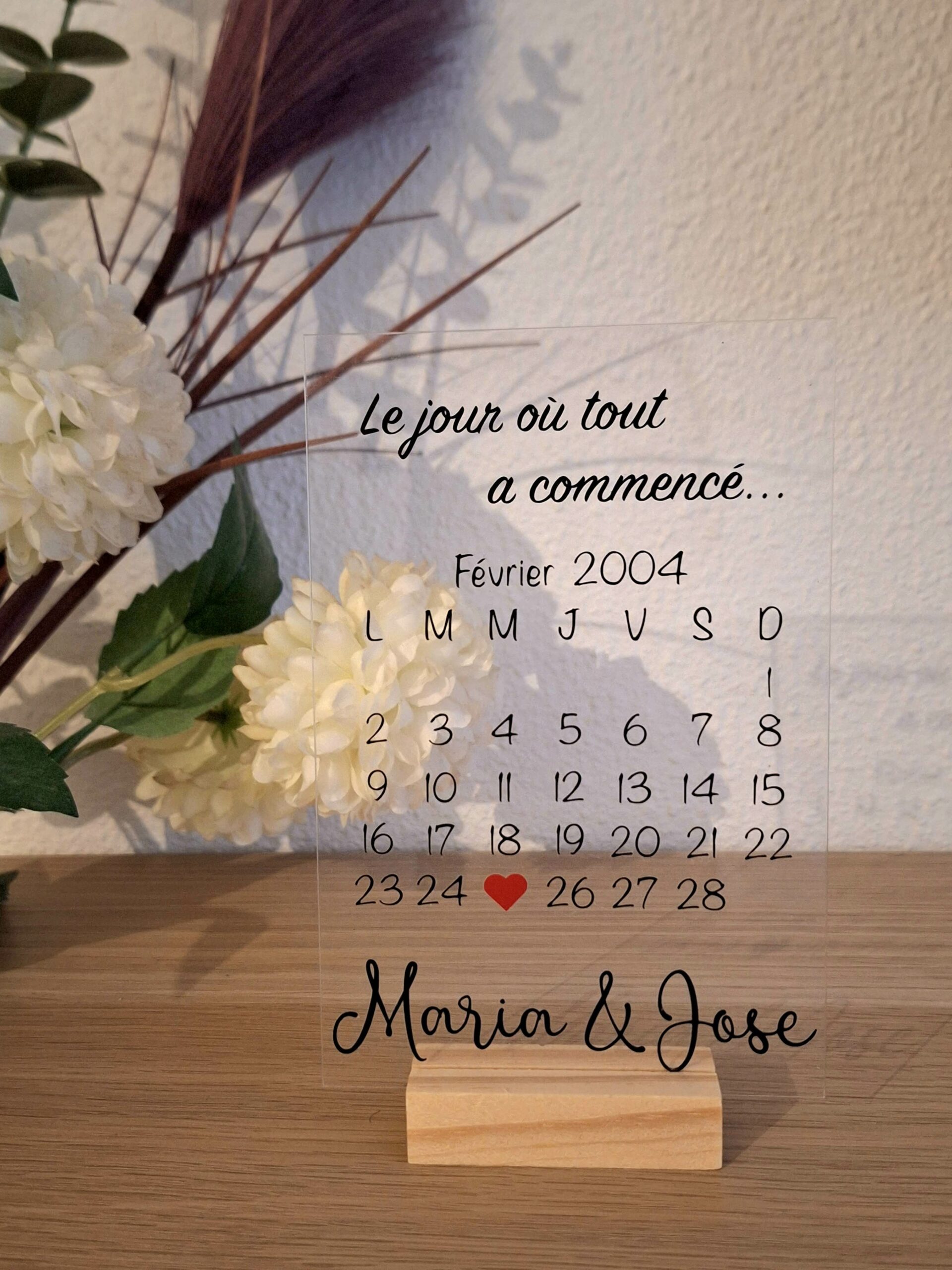 Immortalisez une date spéciale avec ce calendrier personnalisé en acrylique, élégant et intemporel. Ce design raffiné affiche le mois et l’année de votre choix, avec un cœur rouge marquant le jour où tout a commencé – que ce soit une rencontre, une demande en mariage, ou un moment précieux.